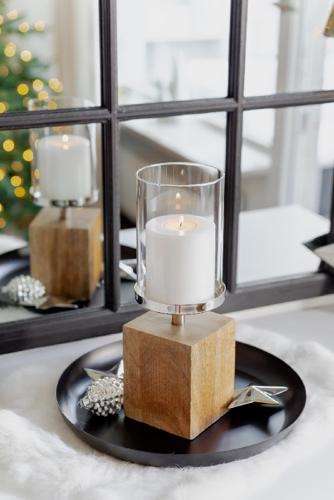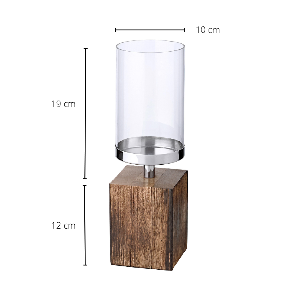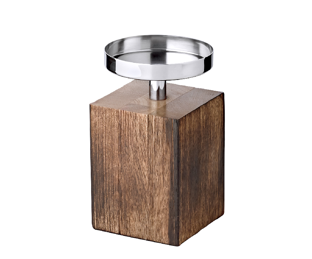 Der Kerzenständer MEO besticht im Design durch den rechteckigen Sockel aus Holz und den Kerzenständer aus Edelstahl. Zusätzlich zum Sockel und dem Kerzenhalter befindet sich eine Art Schutzglas auf dem Kerzenhalter, der diesen daher zu einem Windlicht umfunktioniert. So können Sie den Kerzenständer sowohl im Indoor als auch im Outdoor-Bereich nutzen.