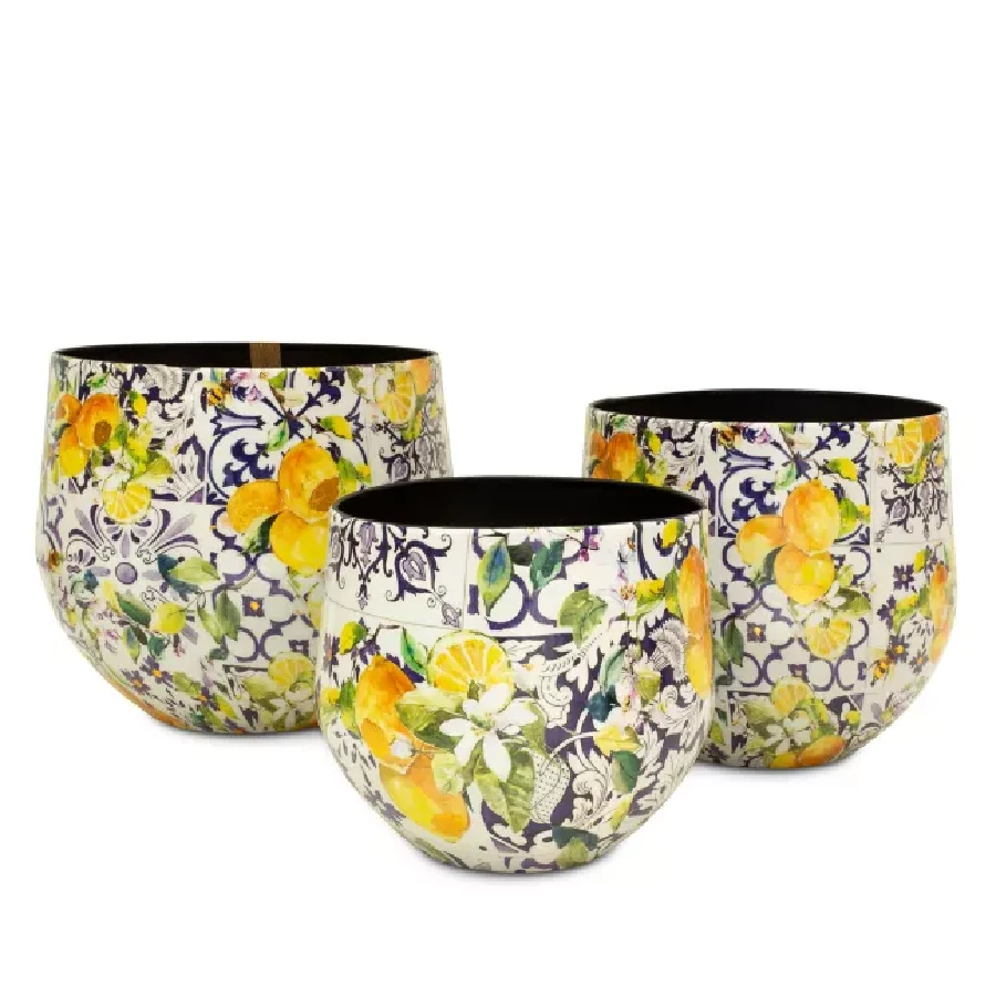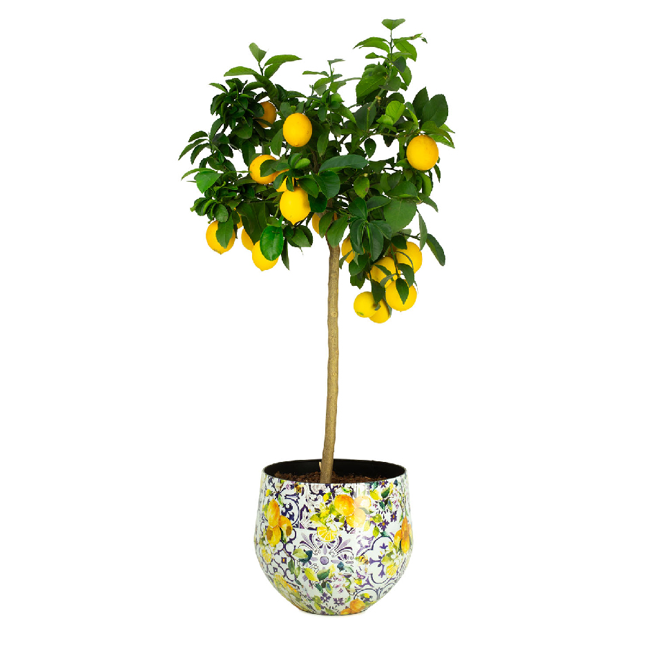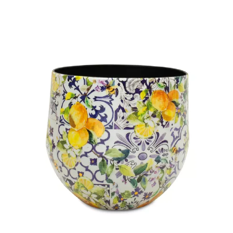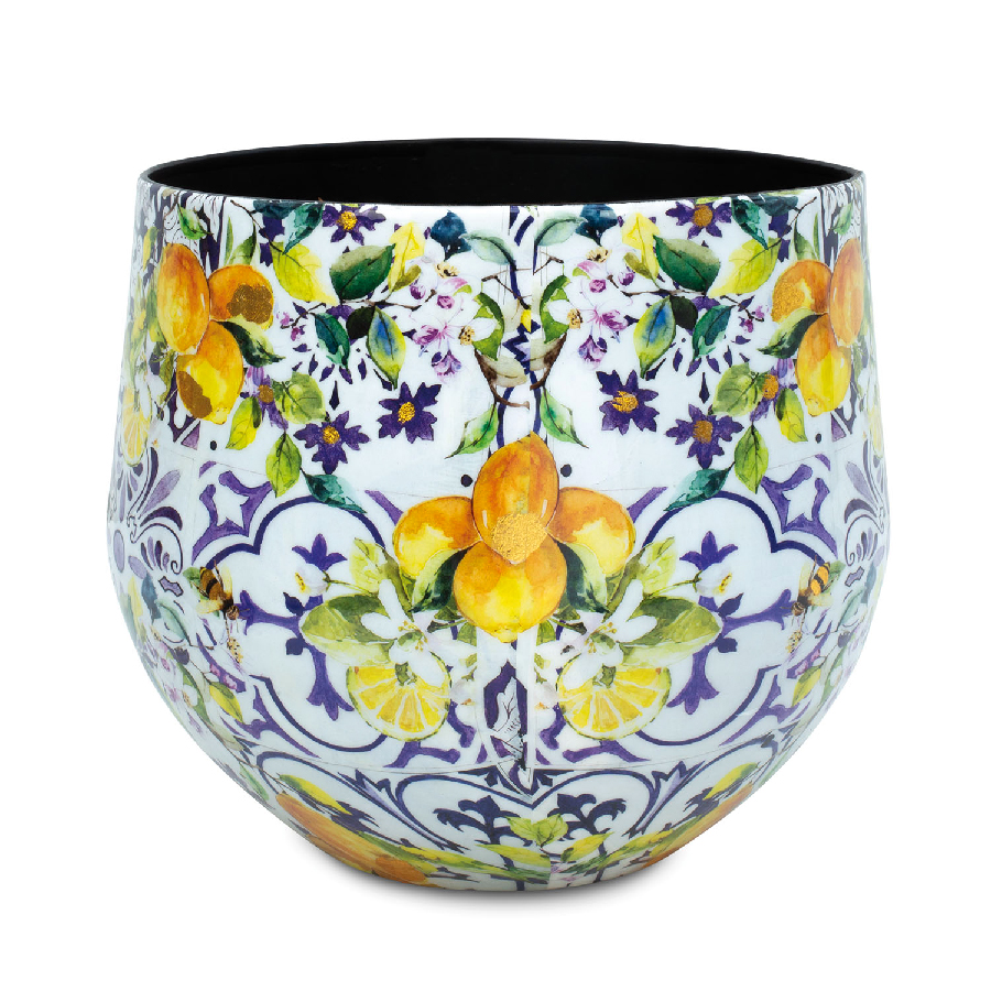 Das Tischgefäß LEMON FUSION fängt den Geist des Frühlings ein. Auf der glatten Oberfläche des Aluminiums kommen die frühlingshaften Farben des Zitronen-Baum-Musters besonders zur Geltung. Das Muster ist vor einem weiß-blauen, gekachelten Hintergrund platziert, der das Gefäß zu einem auffälligen und stilvollen Blickfang macht.