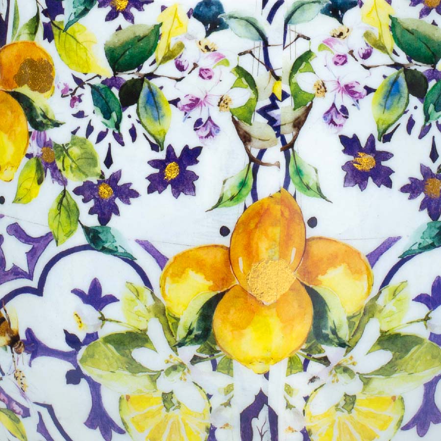 Besonders hervorzuheben ist das glatte Finish, welches die Farbvielfalt des Multicolor-Designs betont. Das LEMON FUSION zeichnet sich durch seine frühlingshaften und ausdrucksstarken Farben aus, die in einem einzigartigen Zitronen-Baum-Muster gegen einen weiß-blauen, gekachelten Hintergrund gestellt sind.