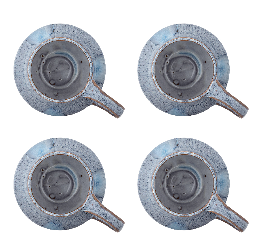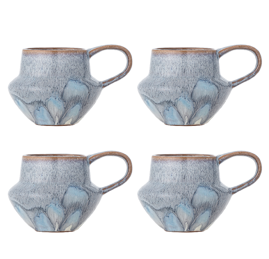 Diese handwerklich anmutenden Becher aus Steingut begeistern mit ihrer einzigartigen blauen Glasur und einer ausdrucksstarken, organischen Form. Die lebendige Glasur verläuft in sanften Nuancen von Blau und Grau und macht jeden Becher zu einem individuellen Unikat - inspiriert von Wasser, Stein und Natur.