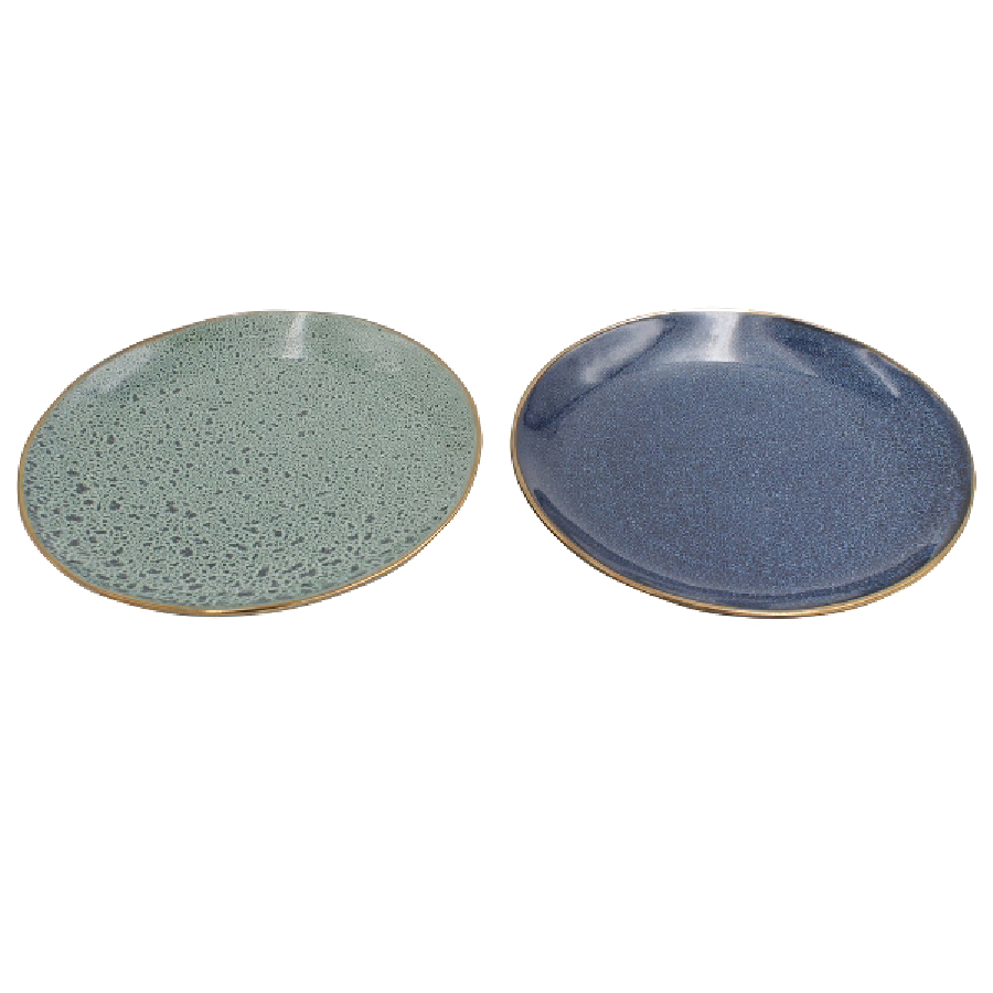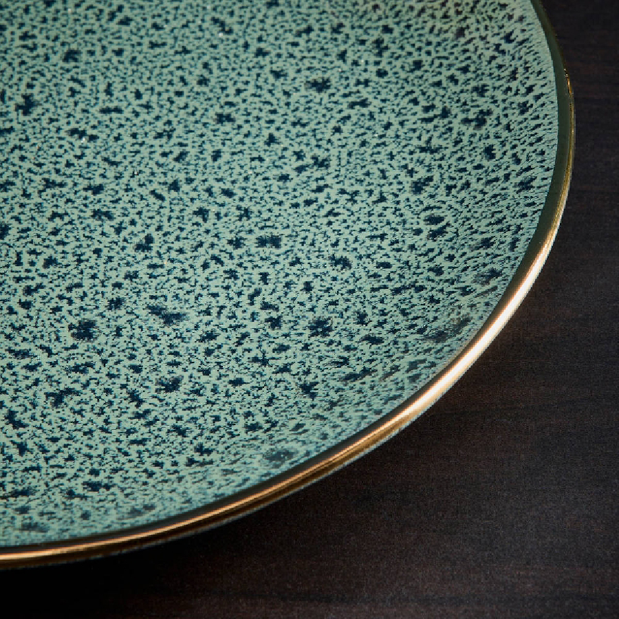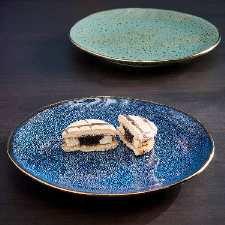 Die Teller der AZUR - Serie sind in wunderschönen Nuancen von gebranntem Blau und Grün und Gold mit einer einzigartigen Reaktivglasur überzogen