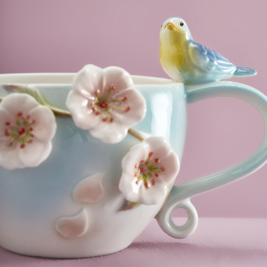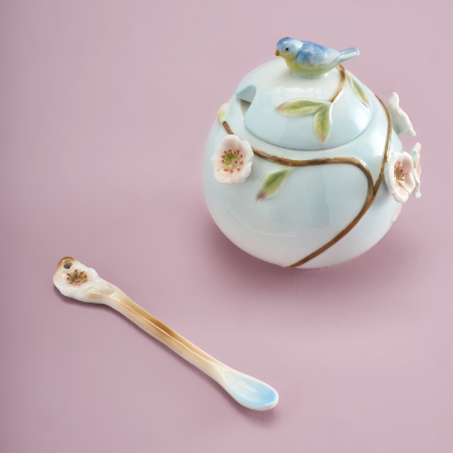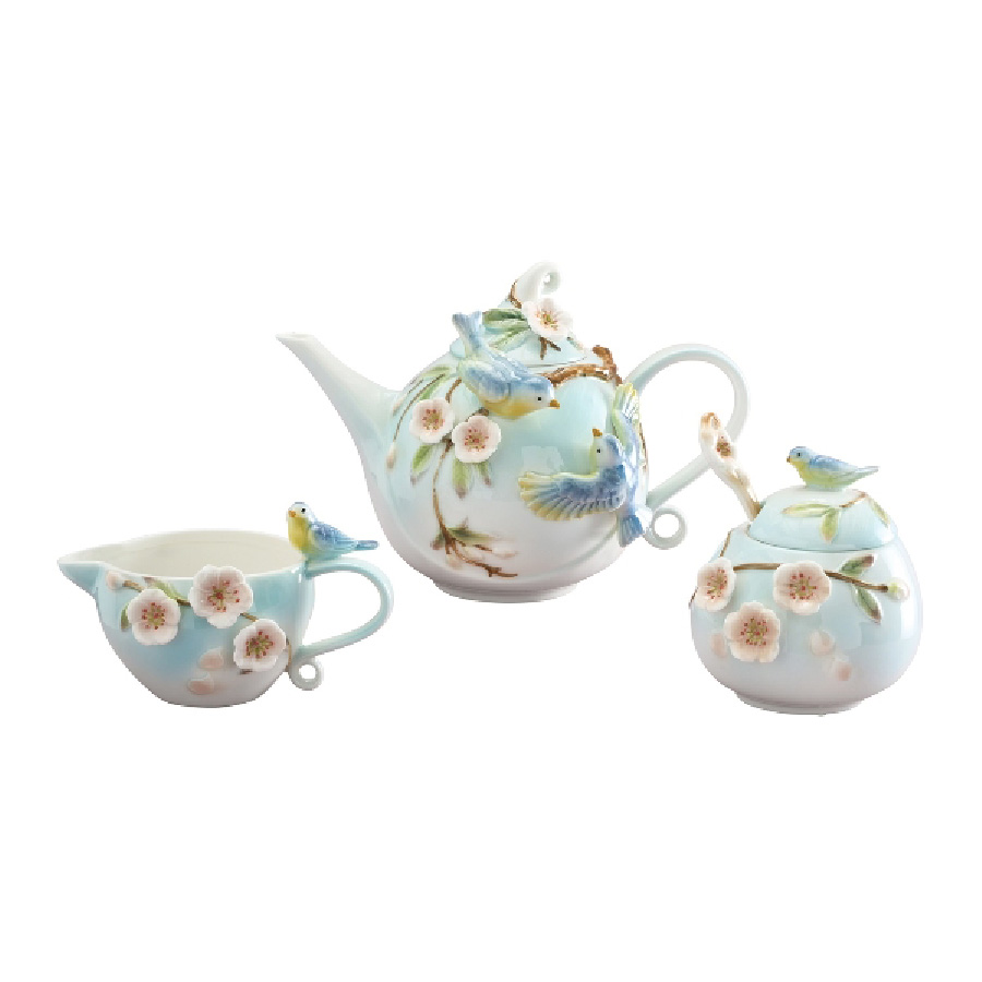 Unser Tee Set BIRDS erinnert sehr an alte Vorlagen der chinesischen und japanischen Teezeremonien. Das Set besteht aus der Teekanne, einem Milchkännchen und der Zuckerdose und ist in bläulich-grünen Farbtönen gehalten. Verziert ist das Set mit kunstvoll aufgesetzten Vögeln und Kirschblüten. Stilvoller kann man seinen Tee kaum genießen.