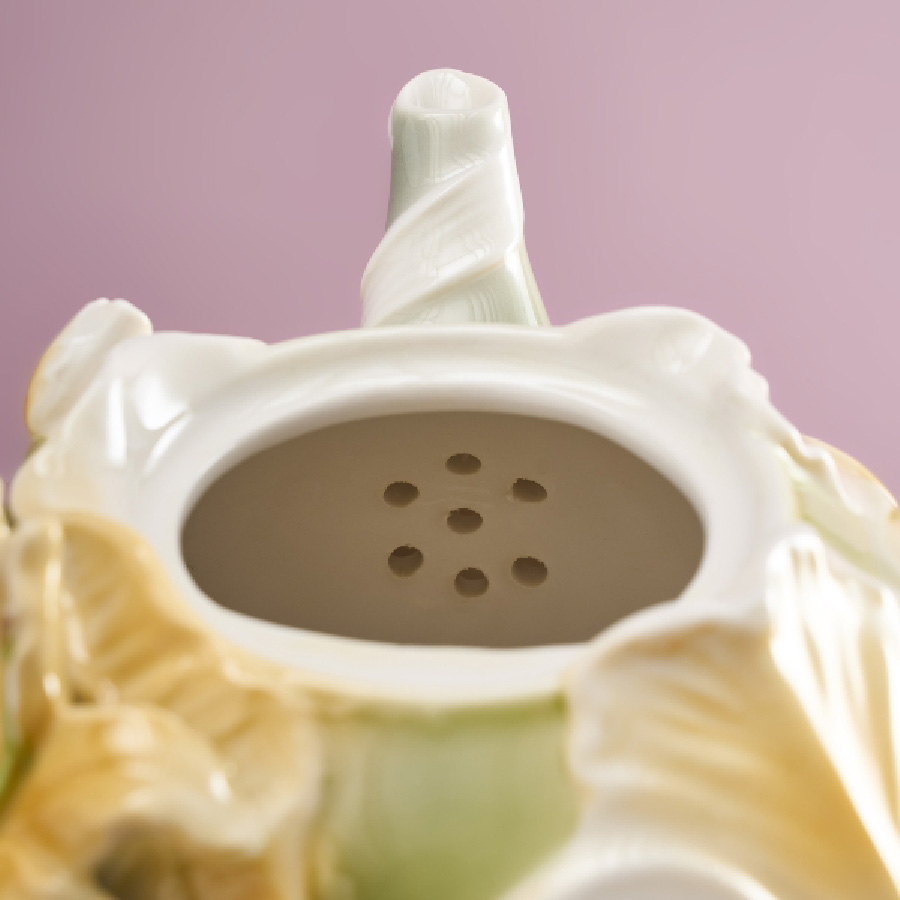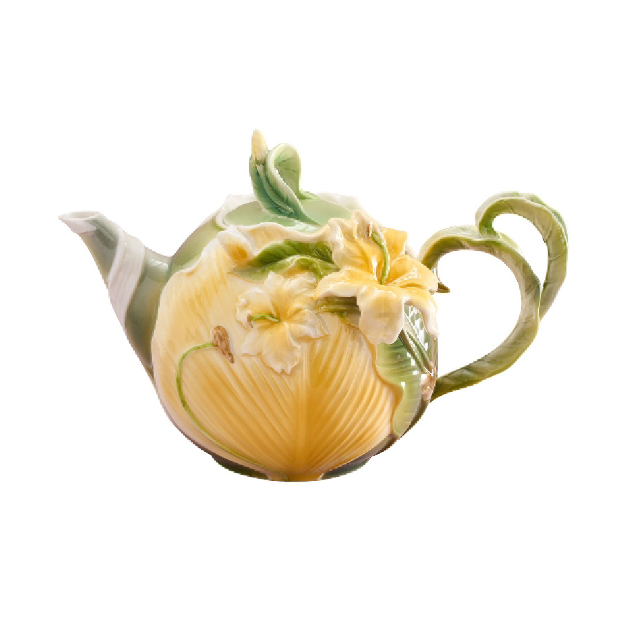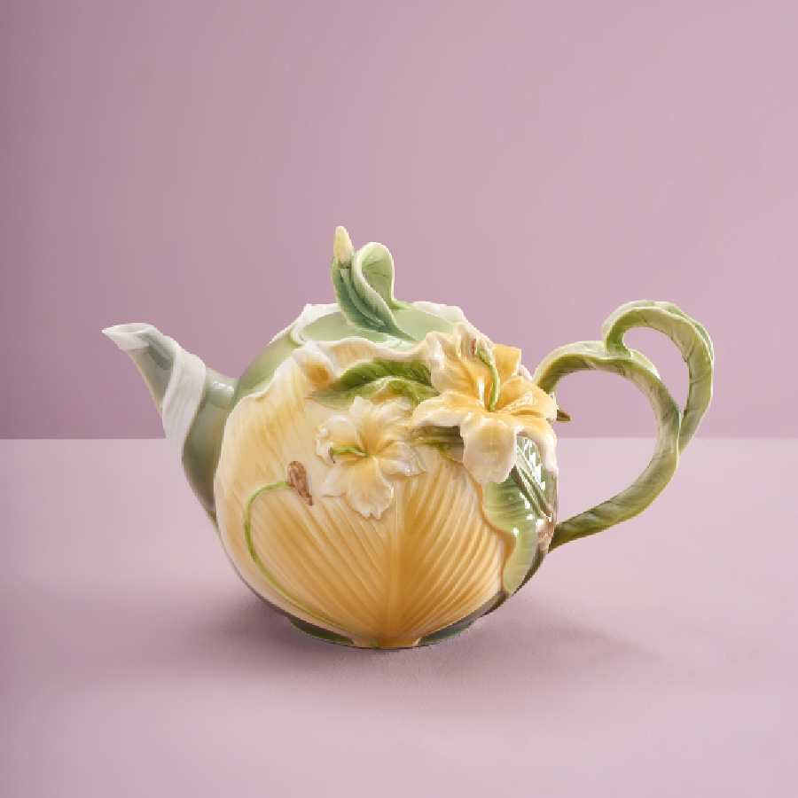 Entdecken Sie die Eleganz der bauchigen Teekanne FLOWERS, die in leuchtenden Grün- und Gelbtönen glänzt. Sie vereint kustvolle Ästhetik mit einem funktionalen Design und ist mit schwungvollen Lilienblüten verziert. Mit dieser Teekanne bereichern Sie Ihre Teerunde mit einem Hauch von Anmut und Naturverbundenheit.