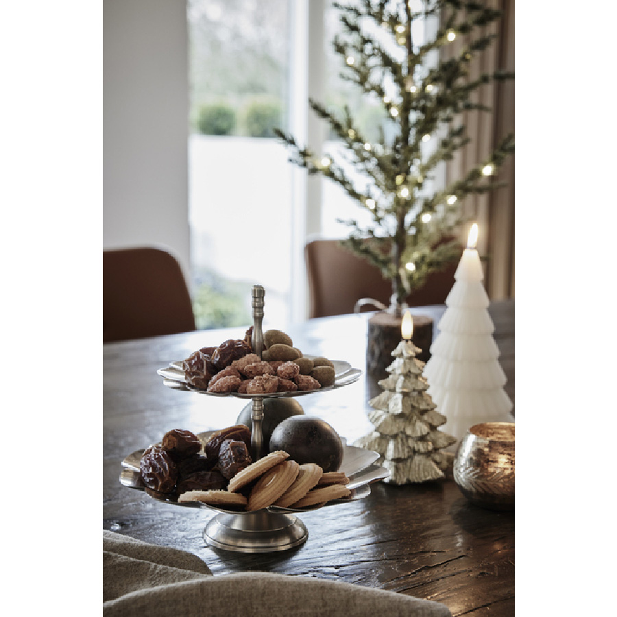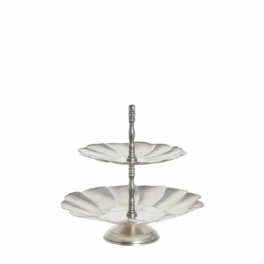 Das zweistöckige Serviertablett PHILINE verleiht jedem Tisch zeitlose Eleganz! Ob Süßigkeiten, Kuchen, Käsehäppchen oder andere Leckereien: Mit der Etagere PHILINE werden diese Köstlichkeiten edel und stilvoll präsentiert. Die filigran gewellten Messingplatten in gebürstetem Silber-Finish versprühen einen gewissen Vintage-Charme und bewahren gleichzeitig eine edle, klassische Ästhetik.