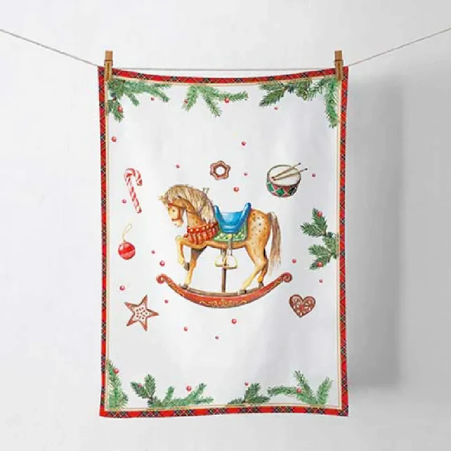 Dieses Küchenhandtuch vereint Funktionalität und weihnachtlichen Charme. In der Mitte brfindet sich ein liebevoll gestaltetes Schaukelpferd, umgeben von Tannenzweigen, Lebkuchen und Zuckerstangen. rauf cremefarbenen Hintergrund. Der rot-grüne Karo-Rand rudet das Design perfekt ab. Das Küchenhandtuch CLASSIC ROCKING HORSE ist nicht nur ein praktischer Helfer beim Backen und Kochen, sondern bringt auch festliche Weihnachtsstimmung in jeder Küche.