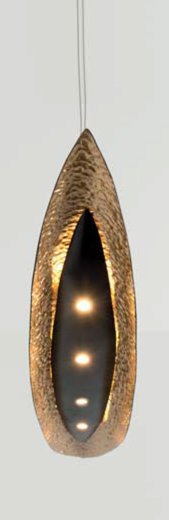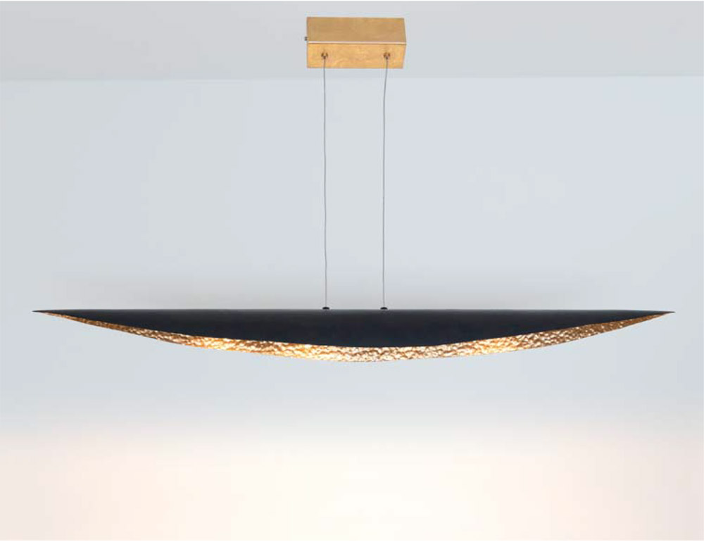 Wer träumt ihn nicht den Traum vom Fliegen? Fliegen... und manchmal werden Träume Wirklichkeit. Denn wer sagt denn, dass ein Mensch nicht fliegen kann? Und wer sagt, dass ein Kanu immer im Wasser schwimmen muss und nicht plötzlich über unseren Köpfen schweben darf?  Diese Leuchte ist außerhalb von Raum und Zeit. Wie ein fliegendes Kanu schwebt sie stromlinienförmig an der Decke und kann dort bei der Erstinstallation stufenlos in der Höhe verstellt werden. Die Oberfläche ist gehämmert und bekommt dadurch ein ganz individuelles Design. Ein goldener oder silberner Baldachin als Blickfang in jedem Raum.