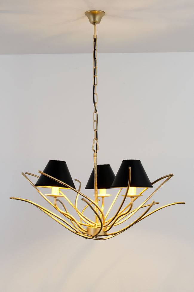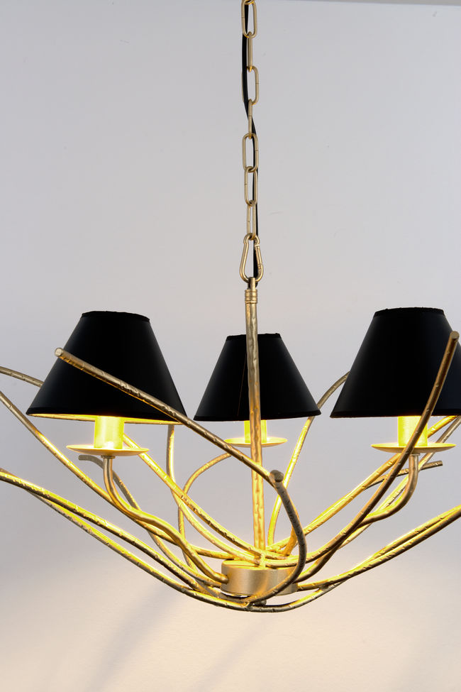 Mystische Welt unter Wasser. Die geschwungenen, goldfarbenen Elemente erinnern an das sanfte Wogen von Seegras und die majestätische Eleganz von Korallen. Die tiefschwarzen Schirme setzen einen edlen Kontrast und verstärken die Anmut der goldenen Strukturen. Faszinierende Schönheit und beruhigende Atmosphäre der Unterwasserwelt.