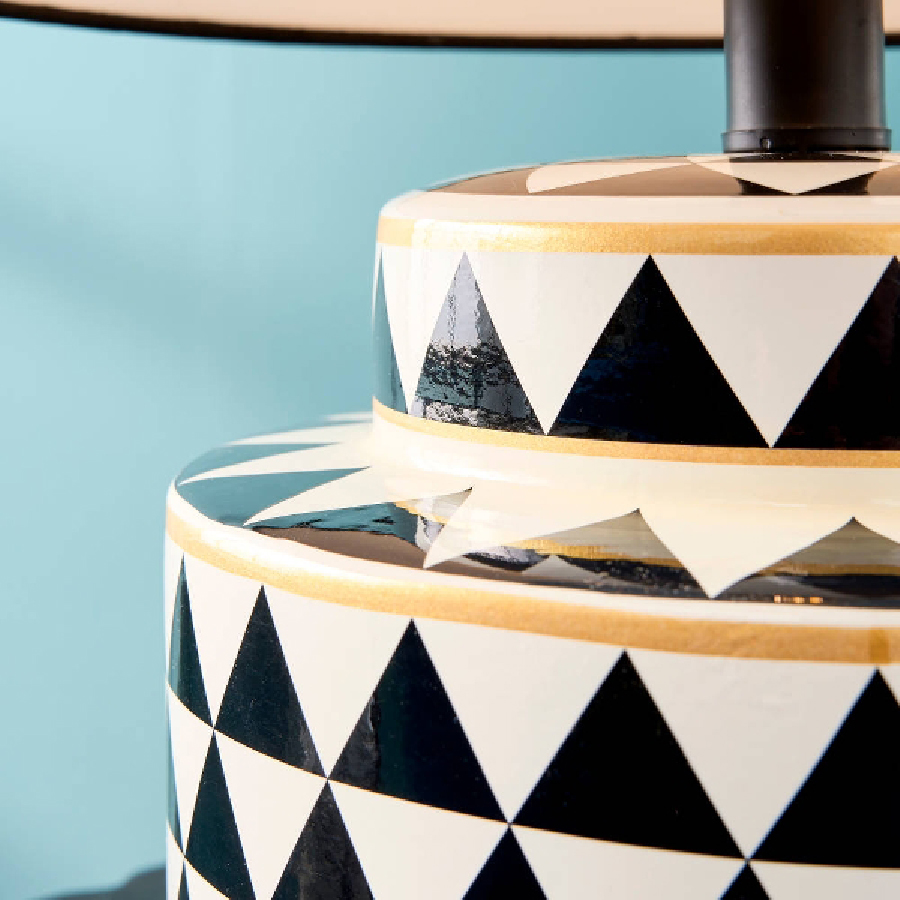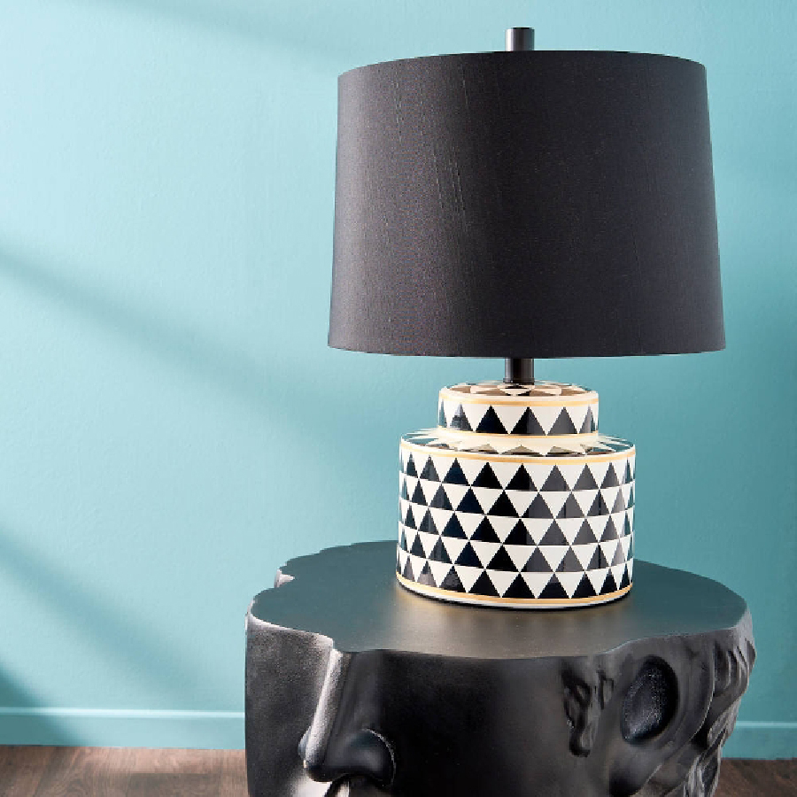 Der Korpus der Tischleuchte wurde mit großem handwerklichen Geschick aus Keramik gefertigt. Der geradlinig geformte Lampenschirm in Schwarz unterstreicht dabei die Gestaltung des Leuchtenkörpers und lässt die Tischleuchte wirken wie aus einem Guss.