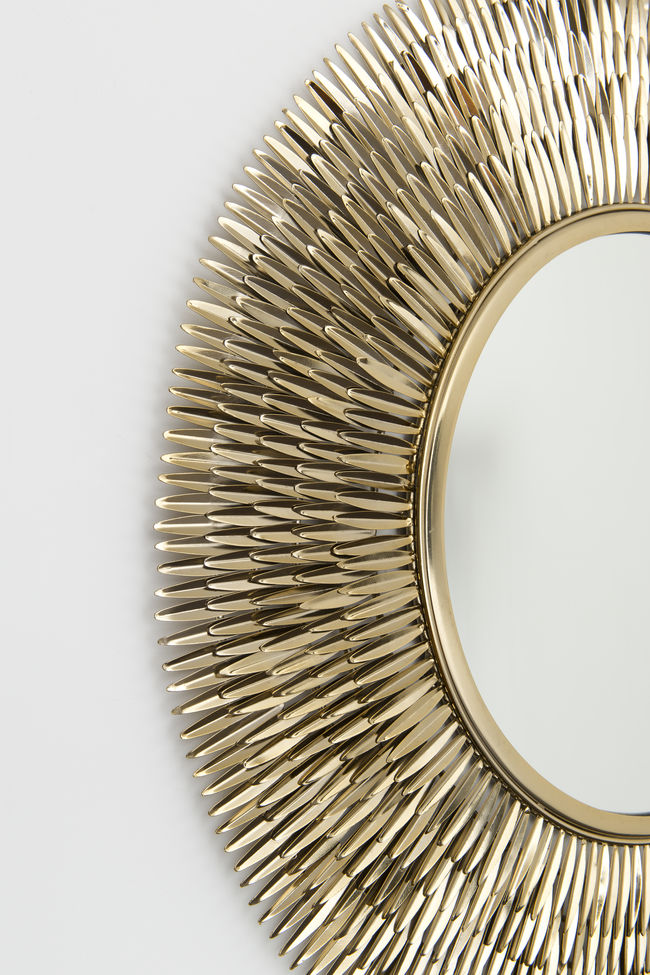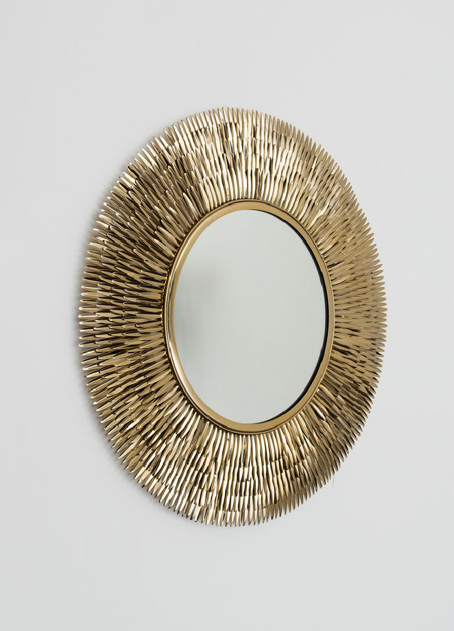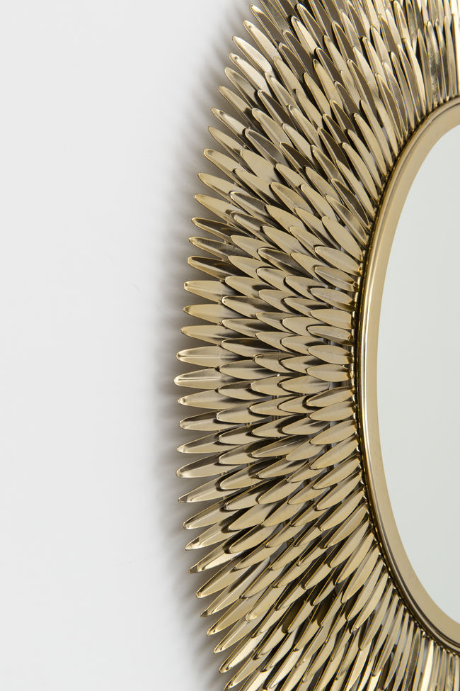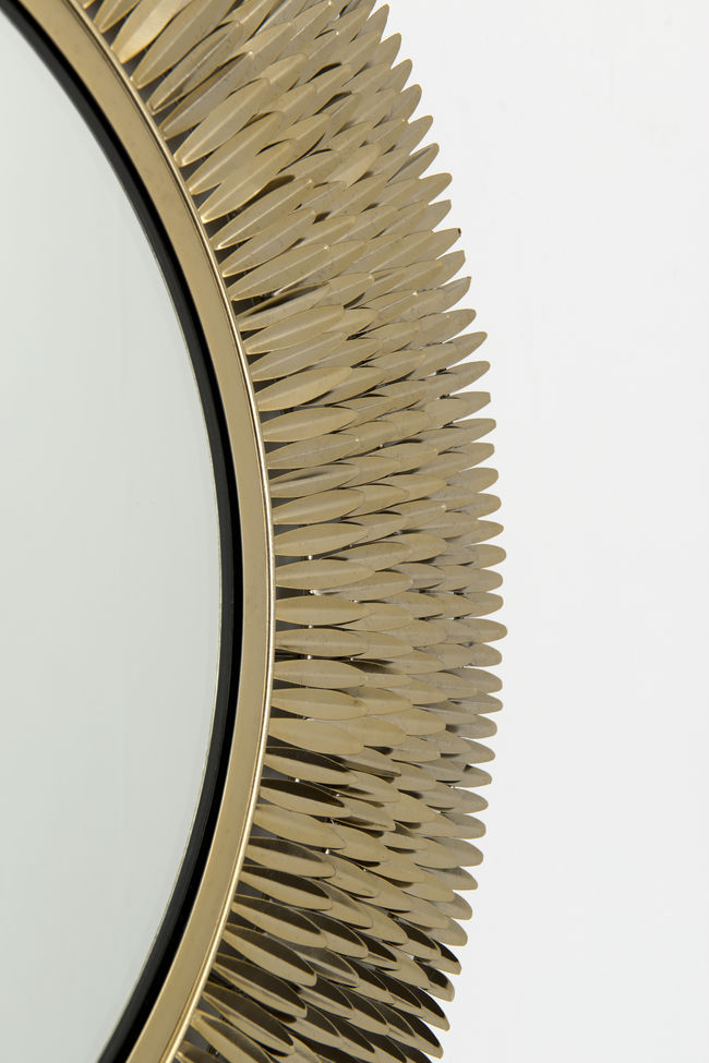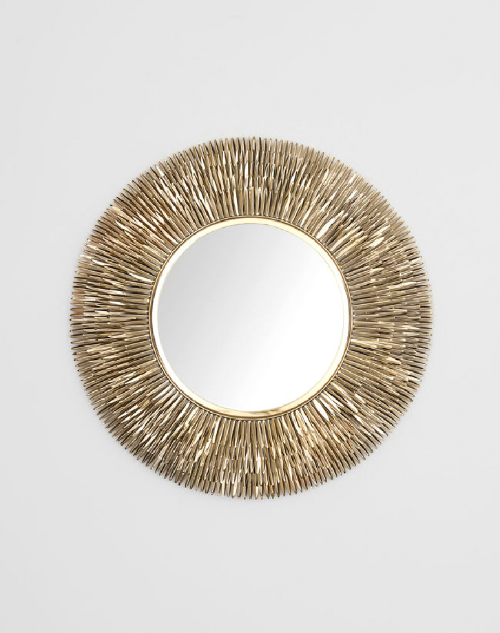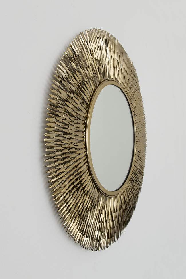 Der Spiegel ist von einer beeindruckenden Rahmenstruktur umgeben, der aus länglichen Aluminiumelementen besteht, welche an feine Federn erinnern. Ein prächtiger Kranz mit einem visuellen Effekt.