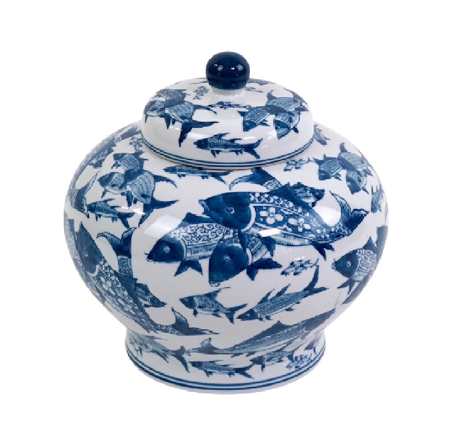 Die Deckelvase DEEP SEA von Werner Voß ist aus Steingut gefertigt und mit einem traditionell weiß-blauen Fisch-Muster bemalt worden. Die Vase überzeugt durch ihre harmonische Formgebung.