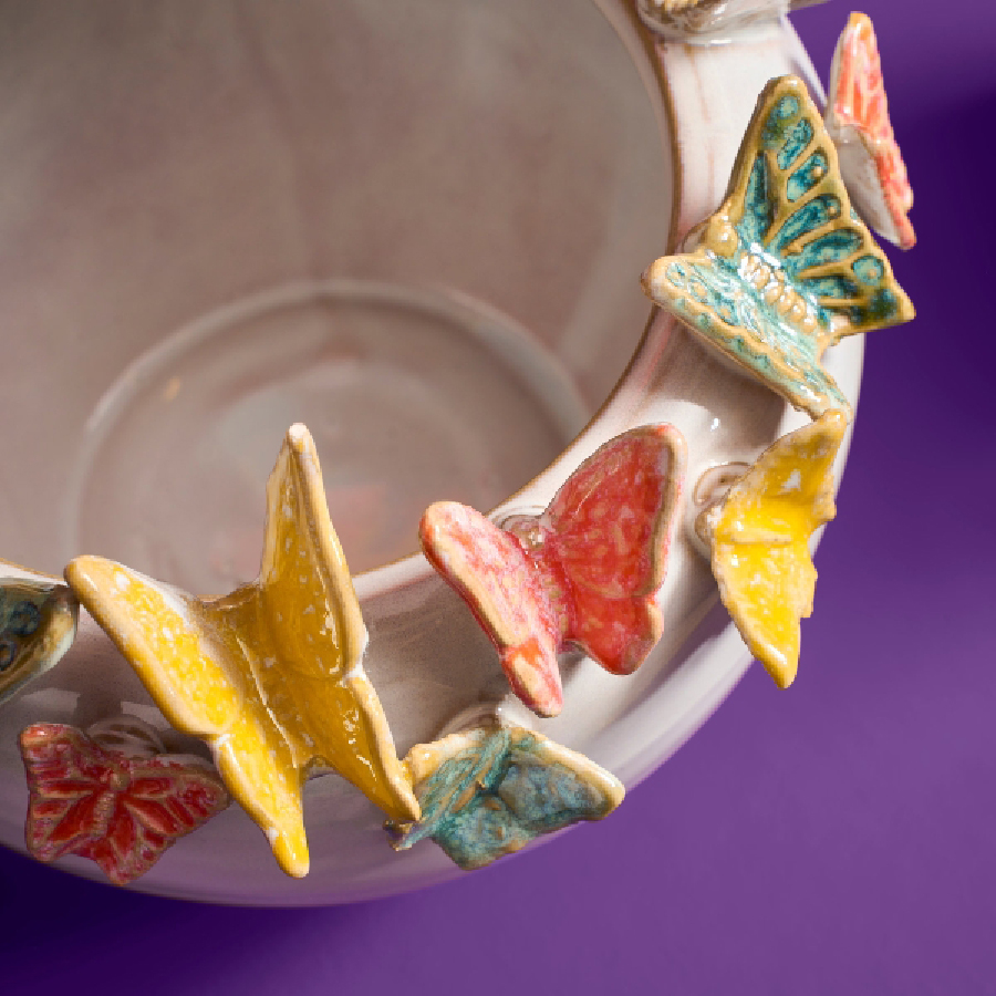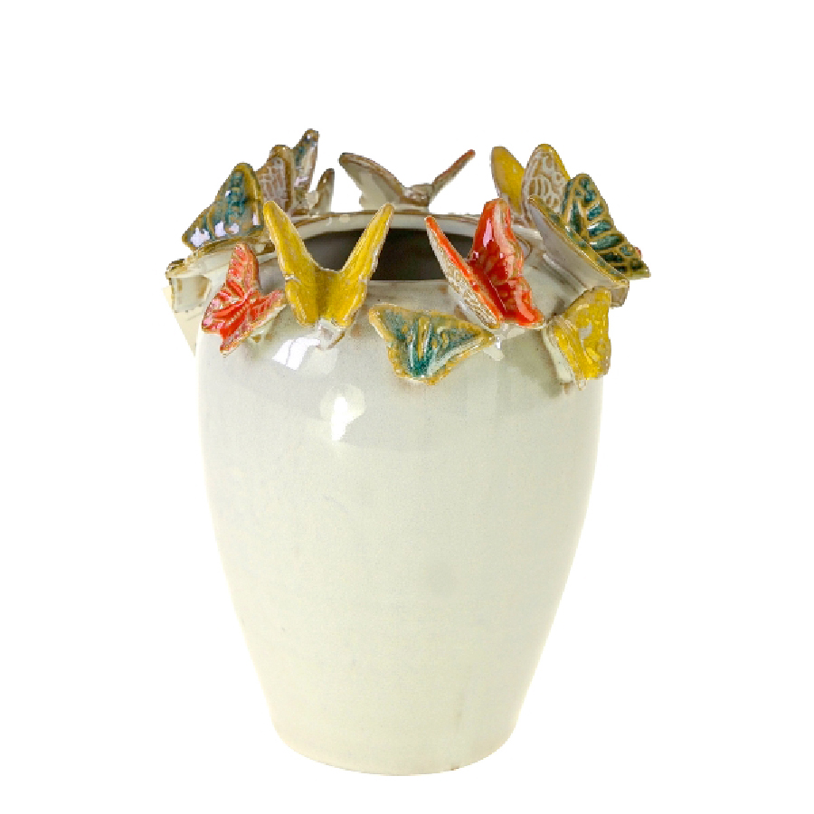 Prächtige Blumensträuße kommen durch eine besondere Vase erst so richtig zur Geltung. Das lernt man leider meist erst, wenn man genau diese passende Vase zuhause vergeblich sucht. WERNER VOß präsentiert hier schicke Vasen aus Steingut mit vielen bunten Schmetterlingen.