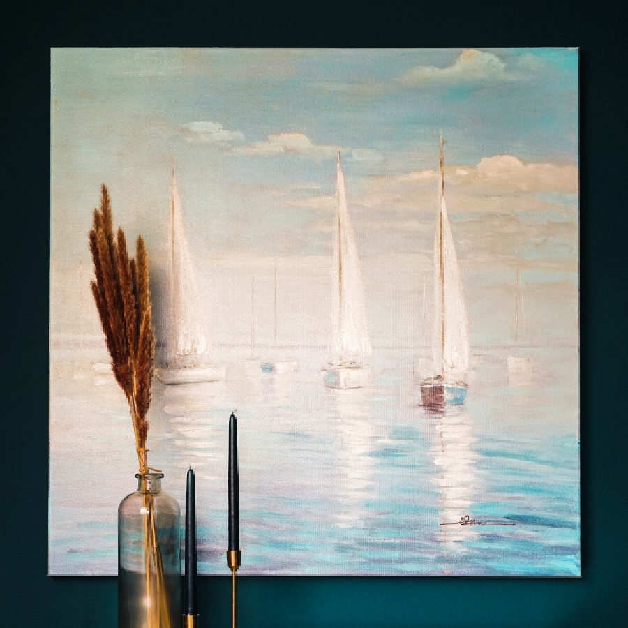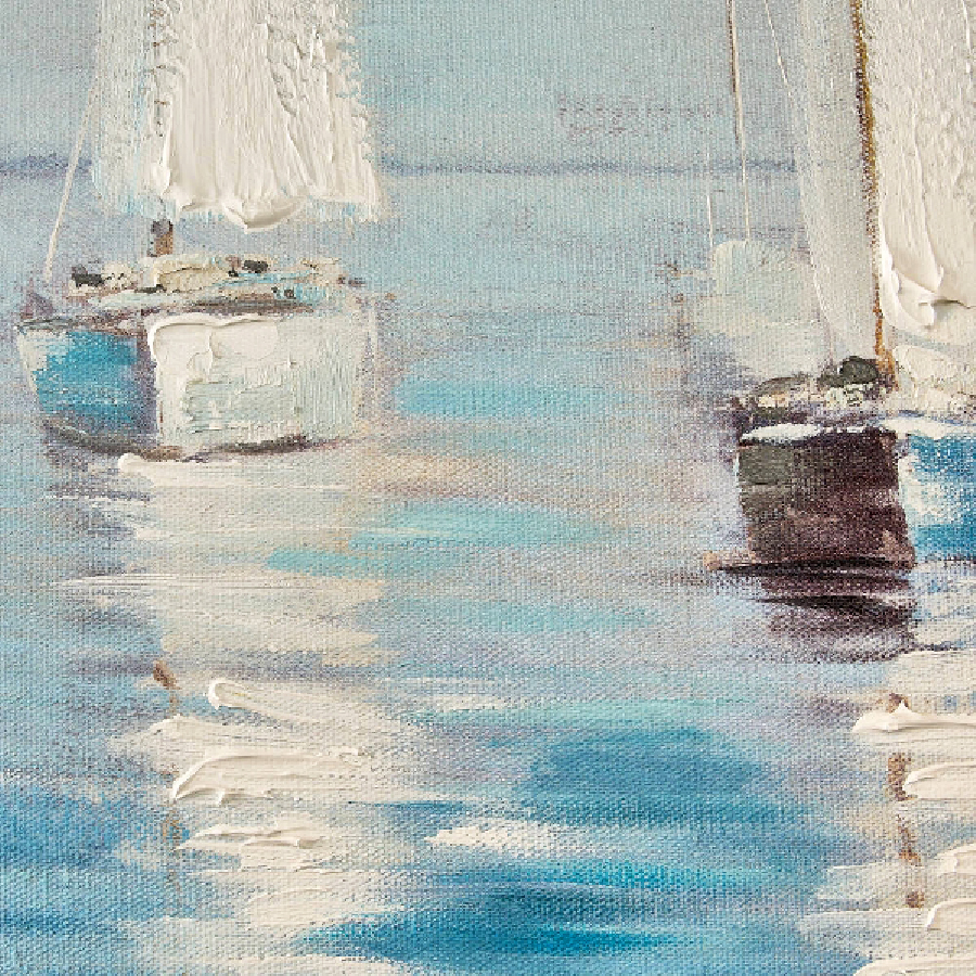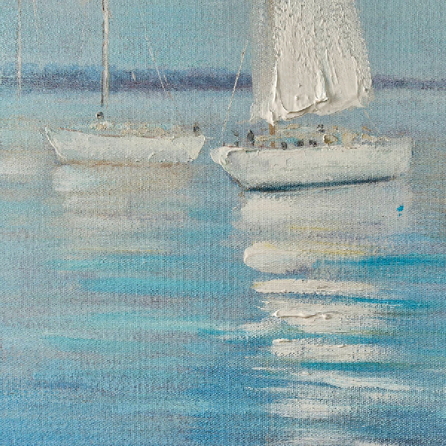 Dieses handgemalte Acrylgemälde auf Leinwand fängt die stille Eleganz von Segelbooten auf ruhigem Wasser ein. Sanfte Blautöne, lichtdurchflutete Wolken und die eleganten weißen Segel verschmelzen zu einer Szene voller Weite, Freiheit und Gelassenheit.