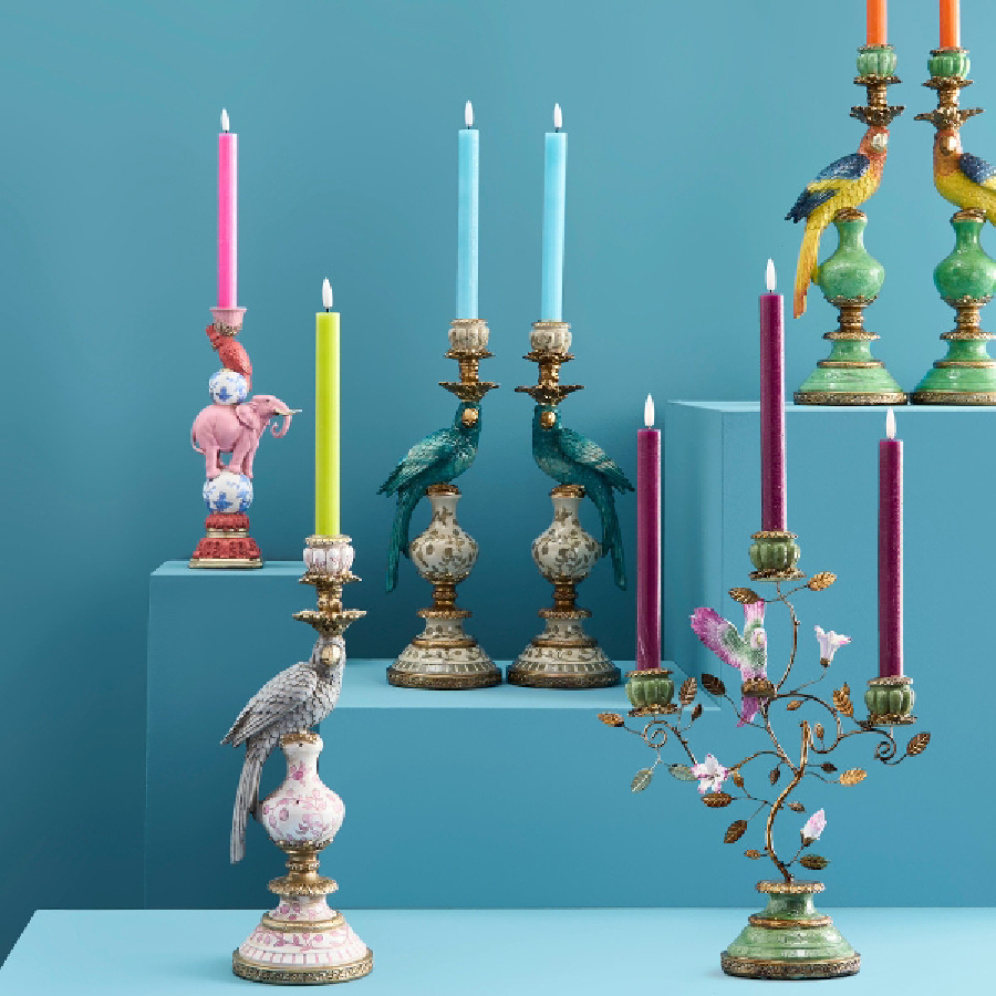 Kerzenleuchter AMARI - ein Hauch von Exotik für Ihr Zuhause. Verleihen Sie Ihrem Zuhause einen außergwöhnichen Akzent: Der kunstvoll gestaltete Kerzenleuchter AMARI vereint edles Design mit detailreicher Handwerkskunst. Auf einem stabilen, kunstvoll verzierten Sockel erhebt sich ein filigranes Geflecht aus goldfarbenen Ranken und Blättern, das von einem prachtvoll gearbeiteten Papagei geschmückt wird.