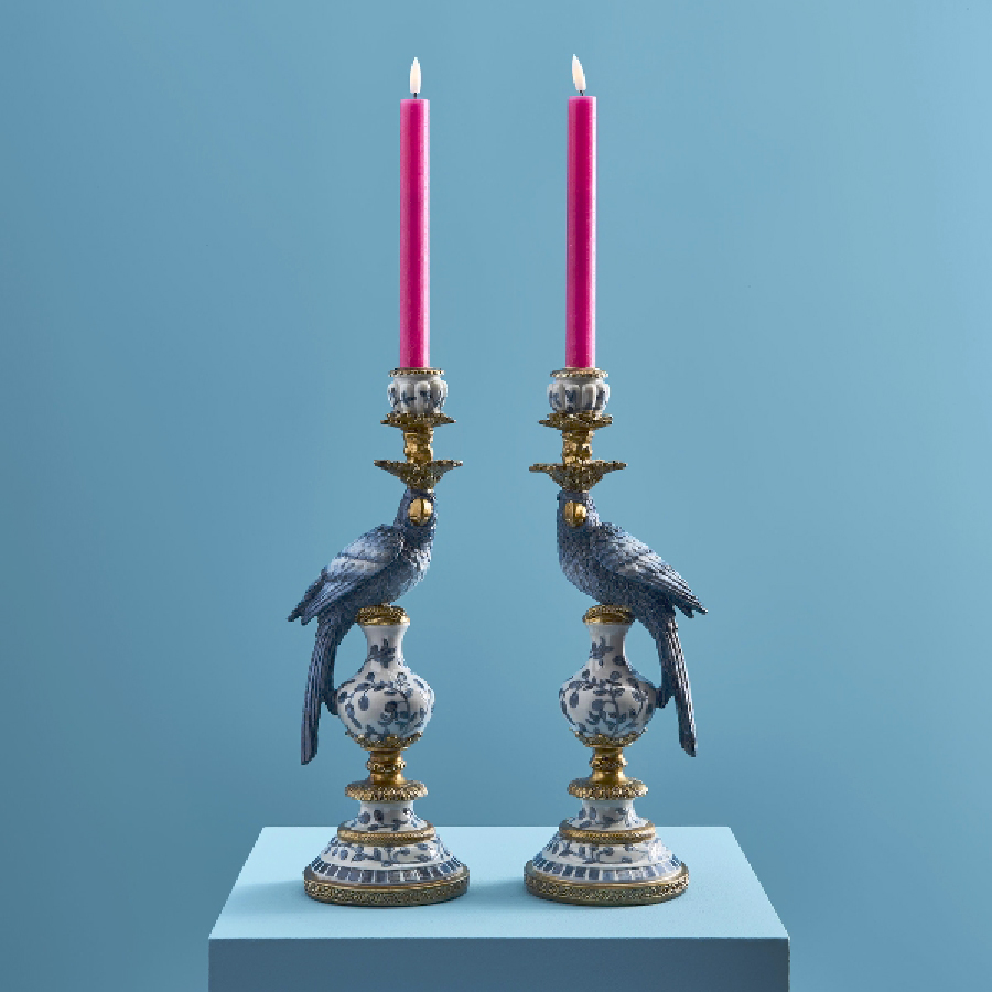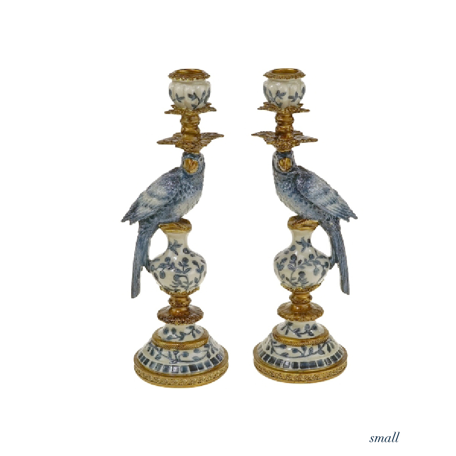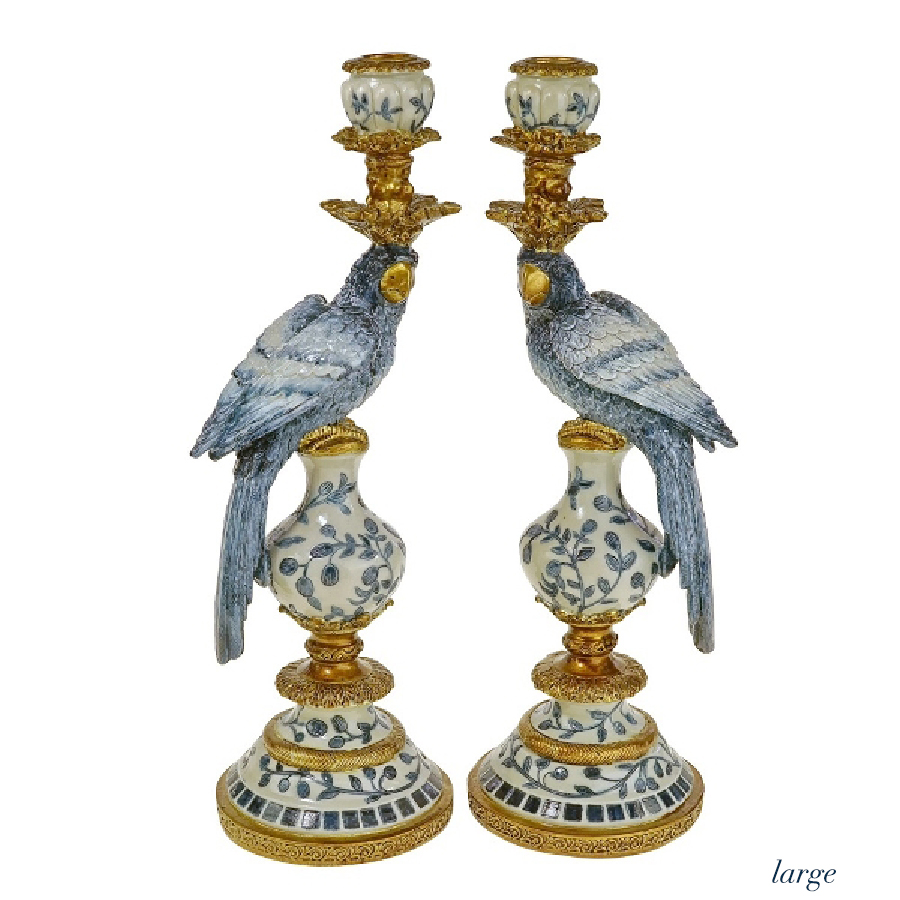 Diese Kerzenhalter kombinieren kunstvoll gestaltetes Polyresin mit vergoldeten Metallelementen. Jeder Leuchter ist mit einem detailliert ausgearbeiteten Papagei versehen und zeigt ein klassisches Blau-Weiß-Dekor. Die Formgebung orientiert sich an barocken Vorbildern, während die vergoldeten Akzente den hochwertigen Charakter unterstreichen.